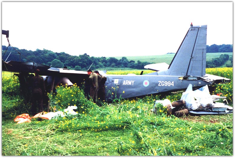 | 30/06/1999 | ZG994 | Islander AL1 | 1 Flt | Crashed near the junction of the A30 and the A343 at Lopcombe Corner, a few miles west of the airfield at Middle Wallop, Hampshire after the pilot had lost control of the aircraft during a simulated engine failure after take off. The two crew escaped without serious injury. The port wing was ripped off in the accident when it struck a tree which also twisted the fuselage. The airframe was transferred from Middle Wallop to Pilatus Britten Norman at Bembridge on the Isle of Wight during October for spares recovery | |