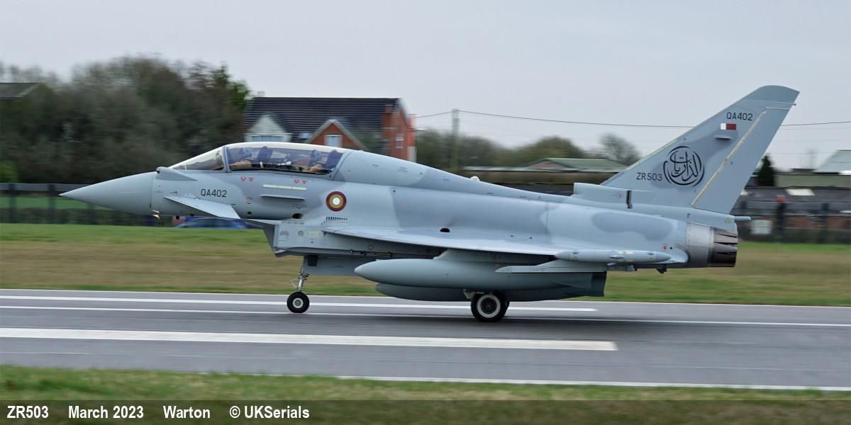 | MT0003 | ZR503 | Eurofighter Typhoon T | f/f 01/12/2022, d/d 21/03/2023 to QEAF as QA402 |  | |